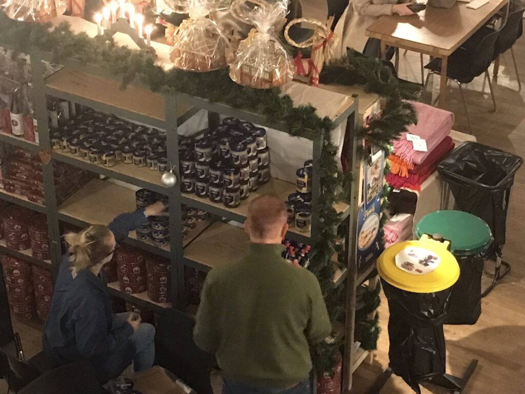 Församlingssalen går knappt att känna igen eftersom den är fylld med hyllor och några kylskåp. Så har det varit i åtminstone en vecka. När Magnus och jag kom i onsdags vid lunchtid var nästan alla varor på plats, men uppackningen och inplockningen och prismärkningen pågick fortfarande.