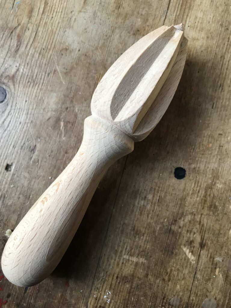 Gropen gör man genom att trycka en sådan här citruspress försiktigt rakt ner i degbollarna eller degskivorna när de ligger i sina pappersformar.