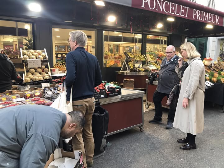 Frukt och grönsaker här — vi missade den försäljare som ofta brister ut i sång men fick smaka på färska fikon och såg massor av vacker frukt, korgar med en kombination av kantareller och persilja, förpackningar med skivad svamp, massor av sparris … Björn handlade och berättade för oss att inhandlingskärra (den som ibland kallas Dramaten) är något som vuxna i alla åldrar använder i Paris, inte alls någon pensionärssak.