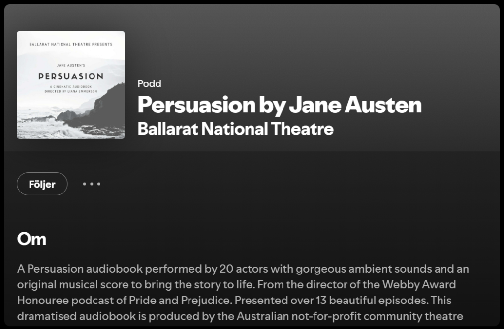 Här kommer ett tips om något som liksom mycket i Jane Austen-världen har kommit till tack vare ideella krafter, entusiasm och kärlek: ett slags radioteaterversion av Övertalning med berättarröst, skådespelare och ljudsättning. Lite australiensk engelska får man räkna med eftersom Ballarat National Theatre är just en australiensisk teatergrupp, och jag vet inte hur många gånger jag har hört dem påminna om Australiens urfolk eftersom jag har lyssnat på den här dramatiseringen och en av Stolthet och fördom mer än en gång. Det ger något extra åt deras produktion tycker jag!