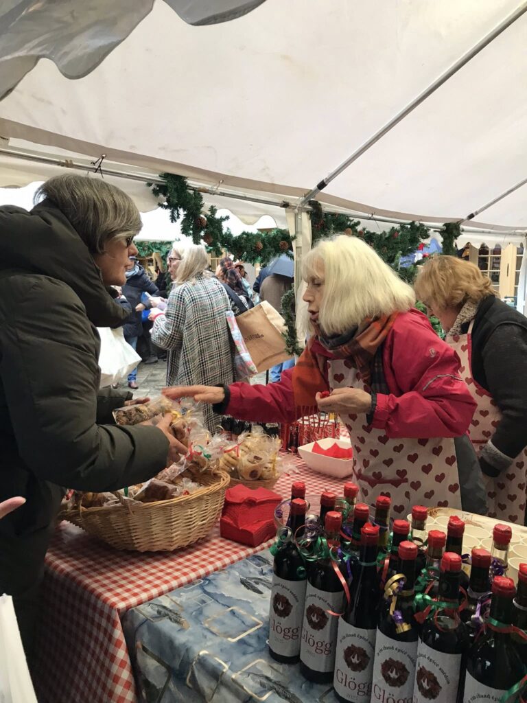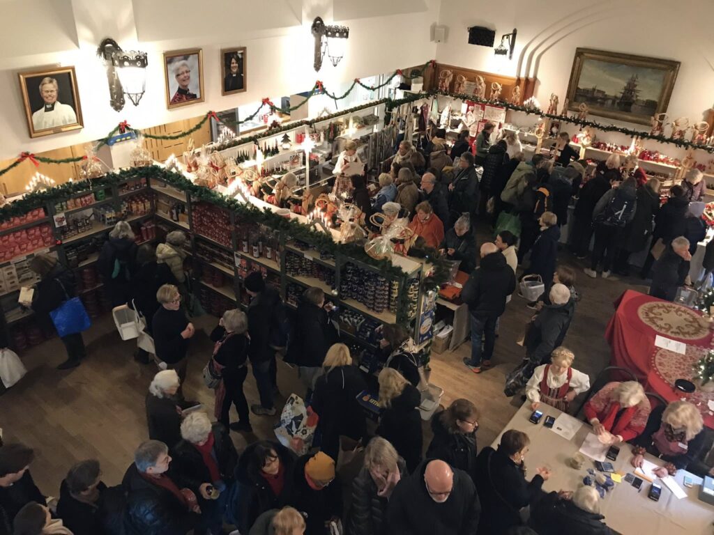 Inne i den stora salen finns matbutiken, designbutiken och församlingens hantverksgrupps butik som min kontaktperson Helene kallar ”adventsbasarens Rolls Royce”.