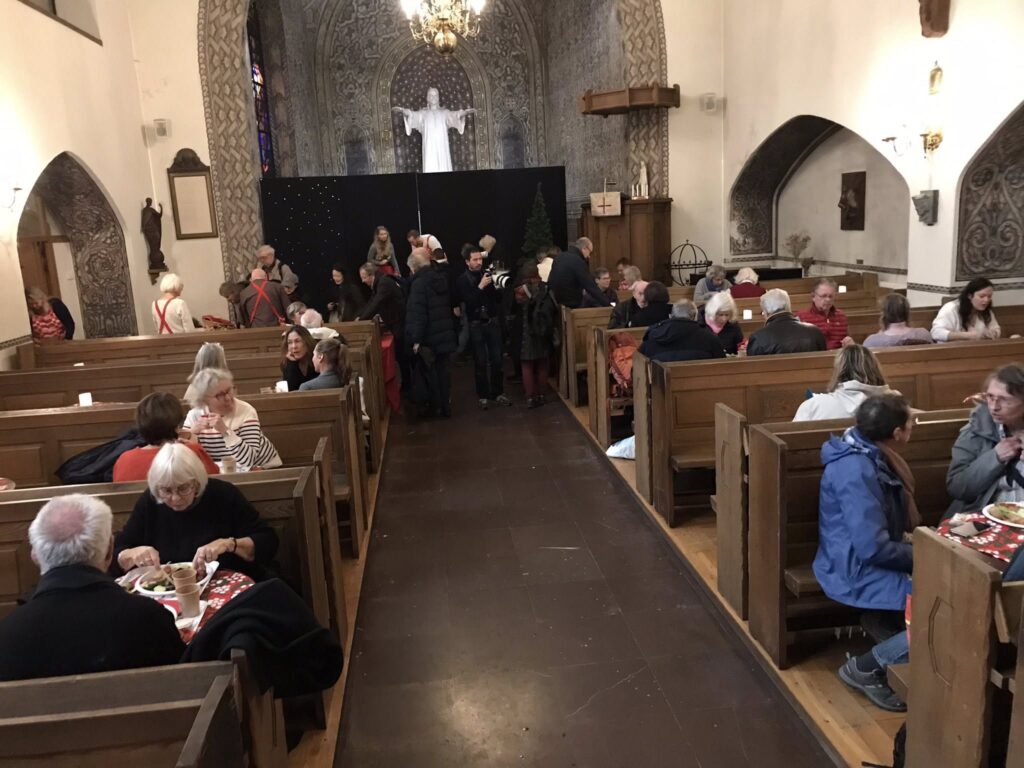 Inne i kyrkan är hälften av bänkarna vända (en spektakulär operation!), cafébord har ställts in i mellanrummen, och man kan äta jultallrik, fika med kladdkaka, kanelbulle eller prinsesstårta och julfika med saffransbulle och pepparkaka.
