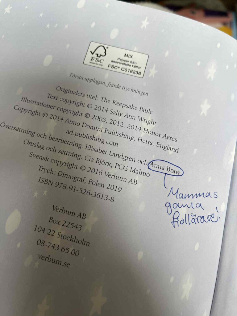 Två bilder som gjorde mig så glad häromdagen — Isabella, som var sex år när hon kom till mig och spelade fiol på en musikskola där jag arbetade 1997–1998, har fått en dotter, och dottern har fått en barnbibel, och världarna möts lite grann!