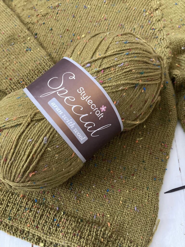 Det finns redan en sådan här tröja, en senapsgul (med samma sorts ”bits and bobs”, de var viktiga när garnet valdes), som jag började sticka när jag var hos Debra i London för fyra år sedan och som jag stickade klart hemma och skickade. Hon klagade på att det inte gick att hitta något som liknade den favorittröja som hon använde hela tiden, och jag som aldrig hade stickat en vuxentröja tidigare sa att jag kanske skulle kunna försöka sticka en kopia av den. När vi hade pratat och ritat lite kom vi överens om den här modellen som har raglanränder istället för isatta ärmar, och jag fick också godkänt på idén att göra dem lite flätliknande. Det hjälpte mig också att hålla reda på varven — ökningar på varv 1, 3 och 5 och så ”snörp” på varv 7!