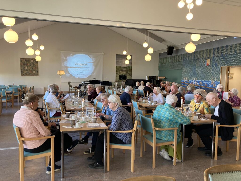 Här är det mesta av våra fina publik — till vänster om bilden var det några bord som inte kom med, och längst fram fyllde det också på så att det blev alldeles lagom att vi satte oss på fyra av stolarna och åt soppa. Fler hade inte fått plats!