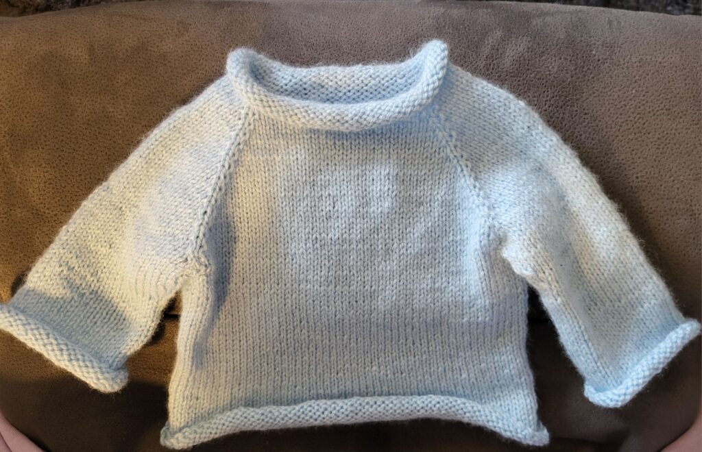 Den här lilla tröjan i raglanmodell, stickad uppifrån och ner och helt i slätstickning så att alla kanter rullar sig på ett vackert och gulligt sätt, har skapat ganska mycket uppmärksamhet i Facebook-gruppen Handarbeta för välgörenhet de senaste dagarna. Nu kom upphovskvinnan Ingela och jag överens om att jag publicerar en lätt bearbetad version av beskrivningen här så att den blir lätt att hitta för alla som letar efter en enkel modell. Jag törs lova att den snart blir en utantillmodell för ganska många!