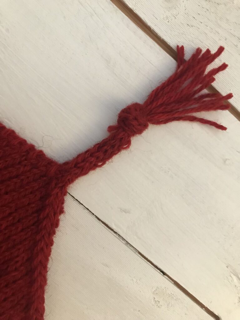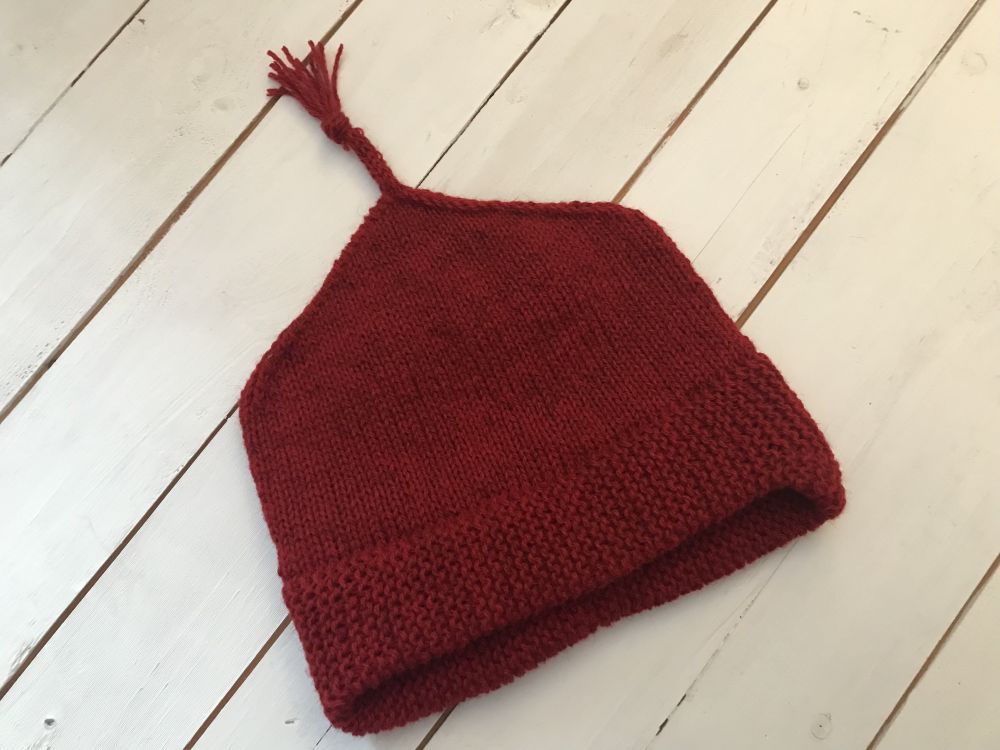 Nederkanten är från Mössan Omtanke, hoptagningen imiterar Melt the ICE, och så avslutade jag med en i-cord på fyra maskor. Jag drog ut åtta långa öglor på det sista varvet (fram och bak i varje maska), knöt så att avslutningen hamnade i knuten och klippte så att jag fick en någorlunda jämn tofs av de sexton trådarna. Nu ska den postas till en väninna!