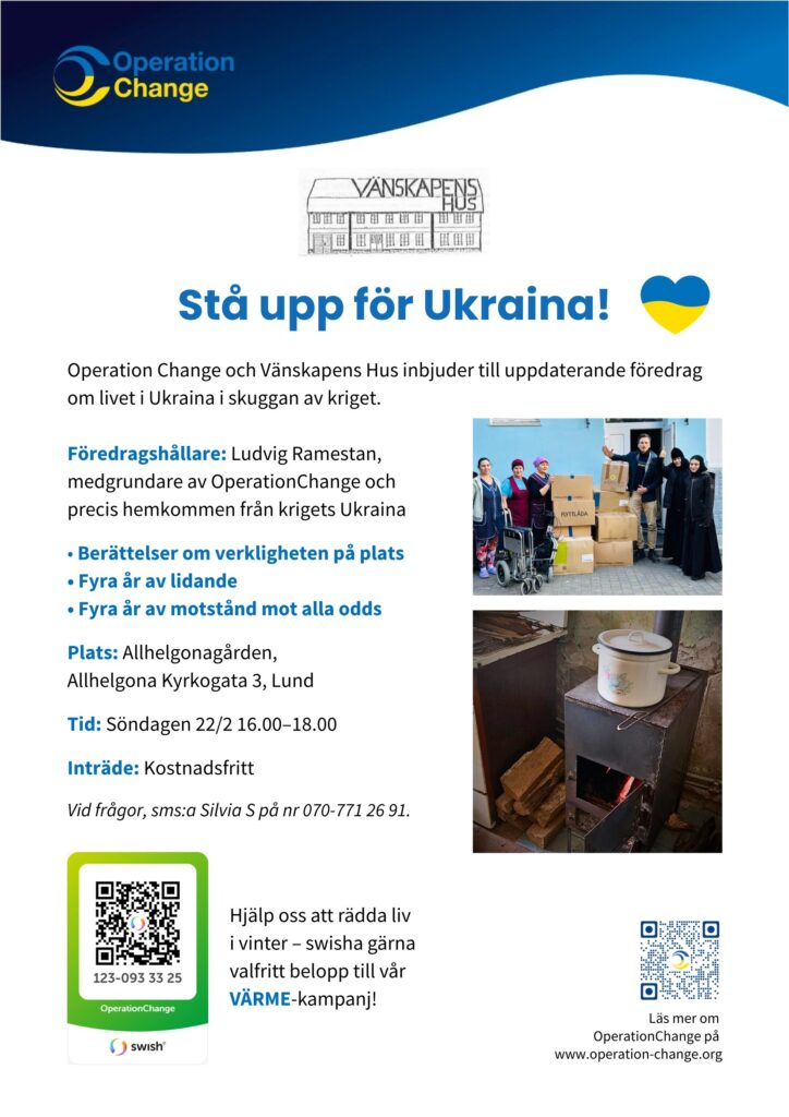 Silvia som arbetar med Operation Change i Lund (och som jag har haft kontakt med sedan vi blev presenterade för varandra på Världsstickardagen vid Lunds domkyrka i somras — mycket bra sammanhang!) har skickat mig en inbjudan till ett föredrag om läget i Ukraina. Den dagen har jag ett föredrag i Älmhult, så frågan är om jag hinner tillbaka. Men ni som kan: gå och lyssna! Det går alldeles säkert bra att sticka medan man lyssnar.